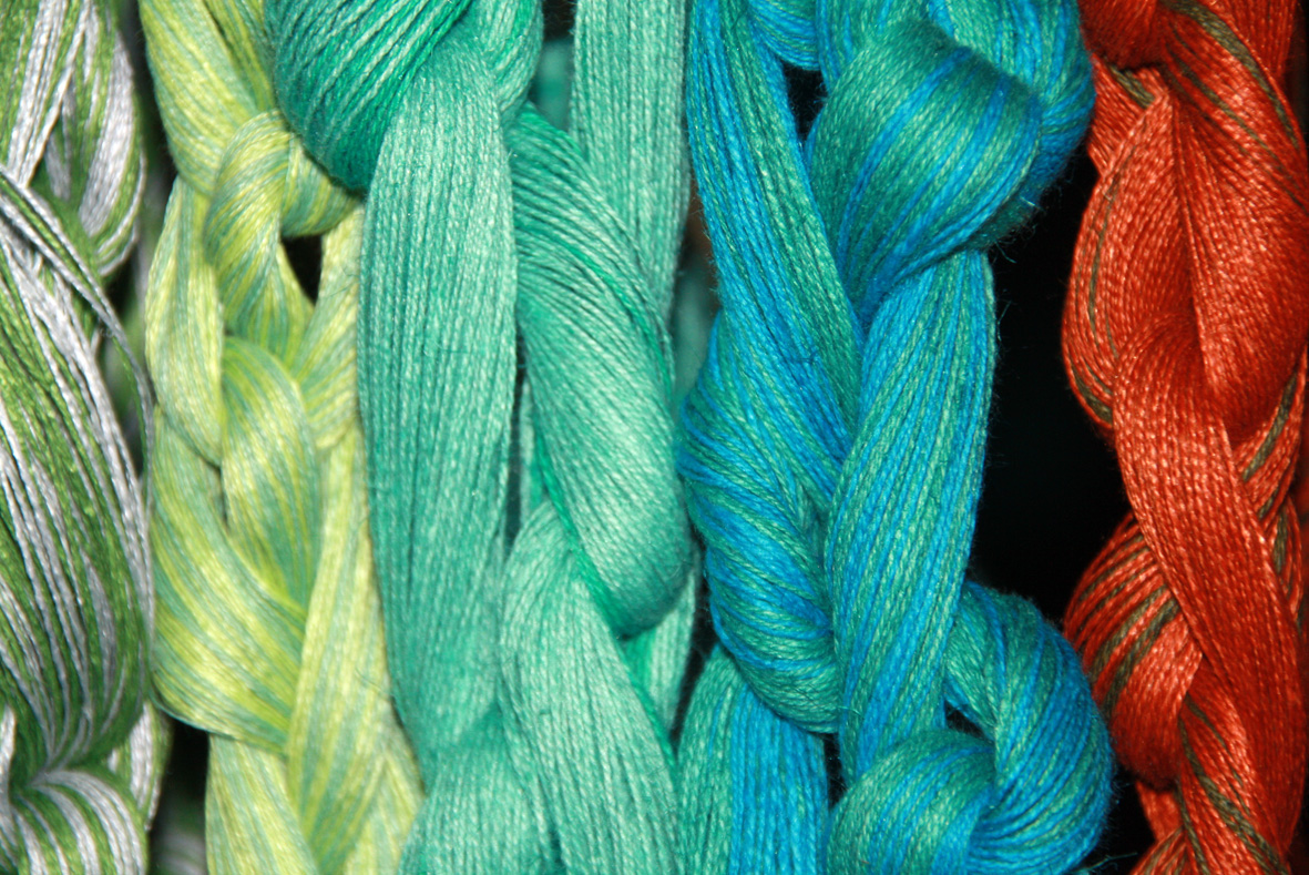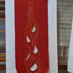 Unsere Paramente und alle anderen textilen Objekte werden aus Naturmaterialien wie Schafwolle, Leinen, Baumwolle und Seide gefertigt. Gold und Silber finden ebenso Verwendung. Naturmaterialien zeichnen sich durch ihre Eigenschaften als besonders gut für Kirchenräume aus. Wolle z.B. kann große Schwankungen der Luftfeuchtigkeit auf ganz geniale Weise regulieren. Sie kann 30 Prozent (ihres Gewichtes) an Feuchtigkeit aufnehmen ohne sich feucht anzufühlen. Deshalb ist dieses Material besonders für feuchte Kirchen zu empfehlen.