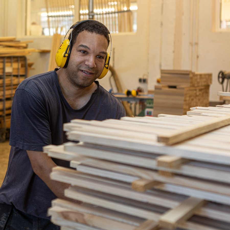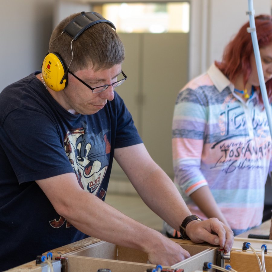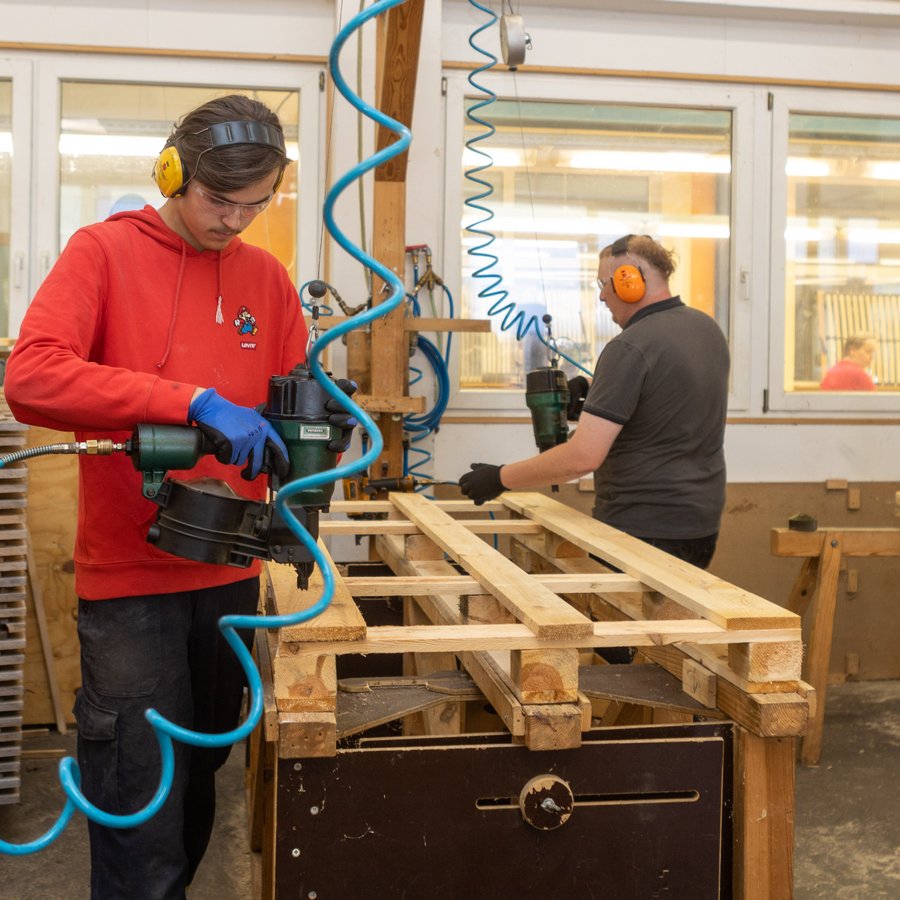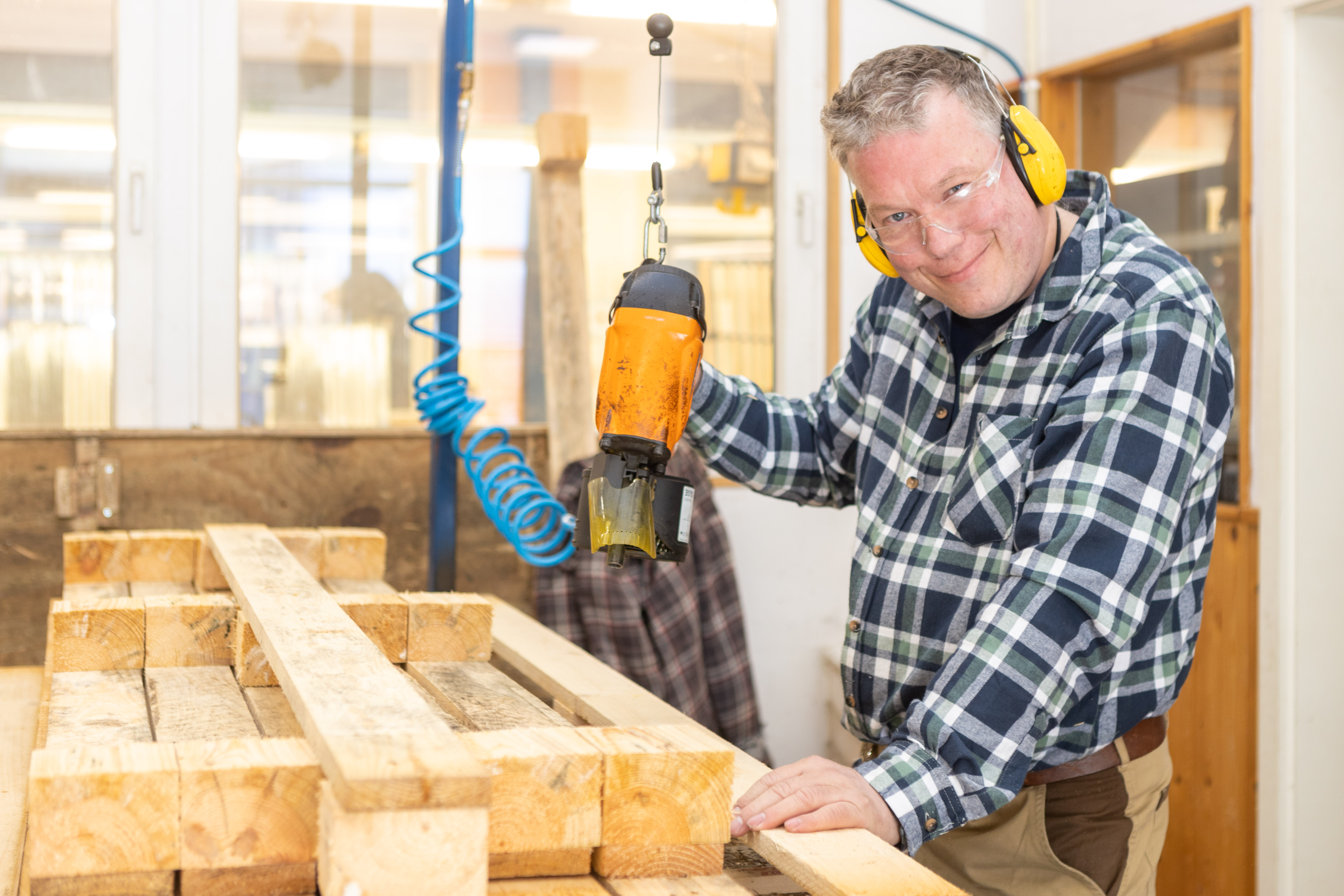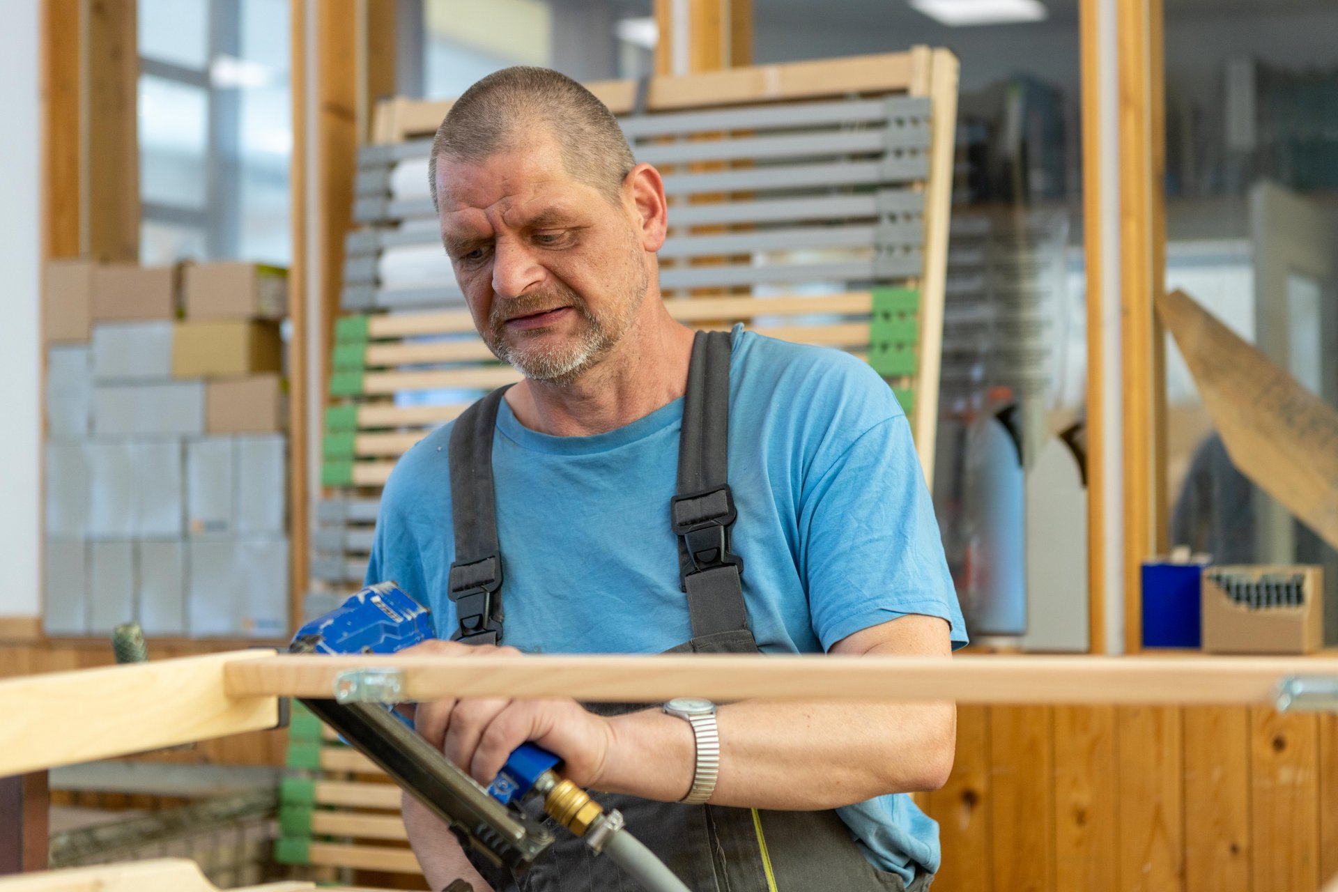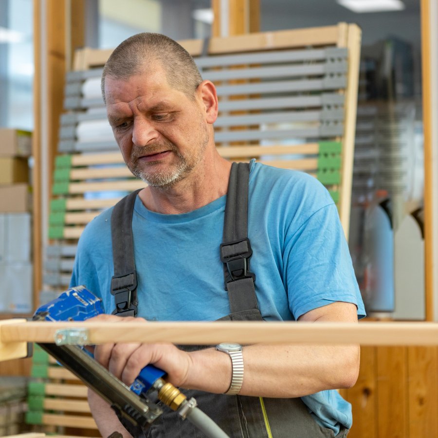 Unser Produktionsbereich Holzverarbeitung bietet bis zu 48 Beschäftigten vielfältige Arbeitsangebote. Von einfachen Komplettierungsarbeiten bis hin zu Arbeiten an professionellen Holzbearbeitungsmaschinen bietet unsere Tischlerei jedem Beschäftigten einen individuellen Arbeitsplatz. Klient*innen bedienen Flurförderzeuge, wie Gabelstapler und Ameise. Ihr Einsatz erleichtert den Transport der Halb- und Fertigwaren innerbetrieblich sowie das Be- und Entladen von LKW.