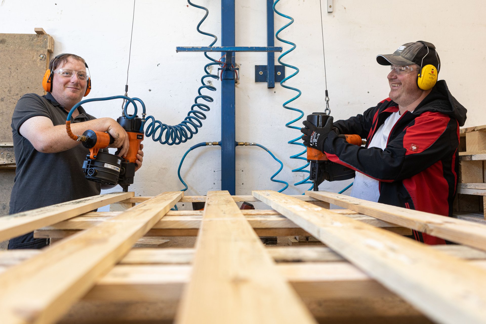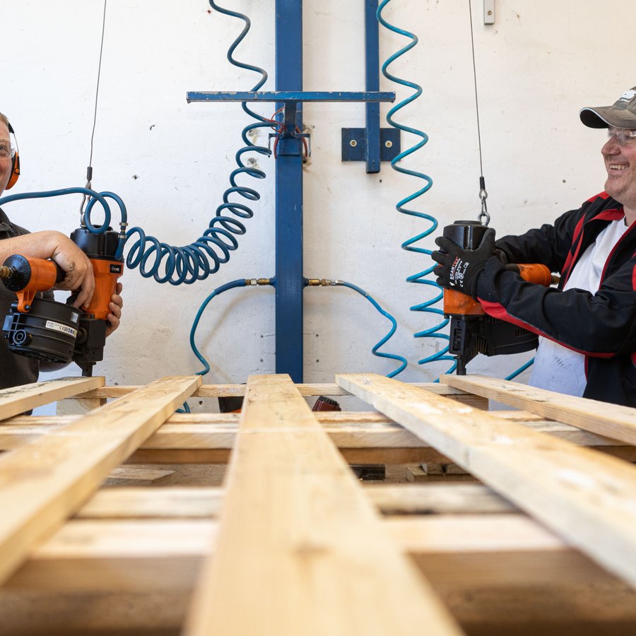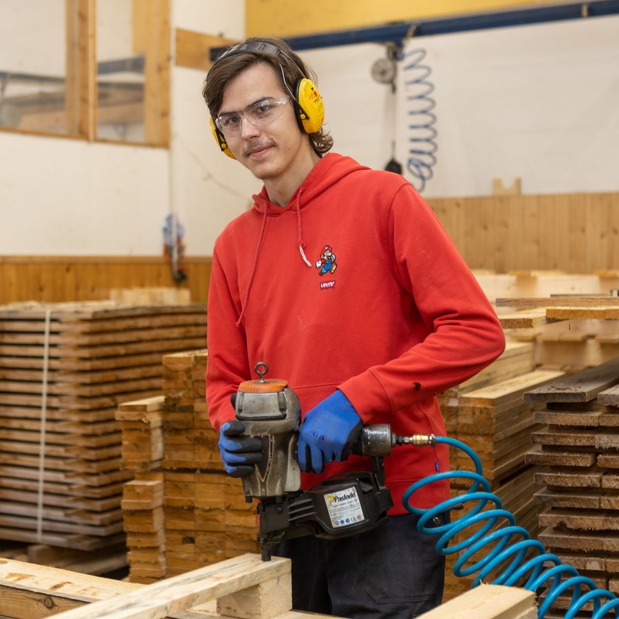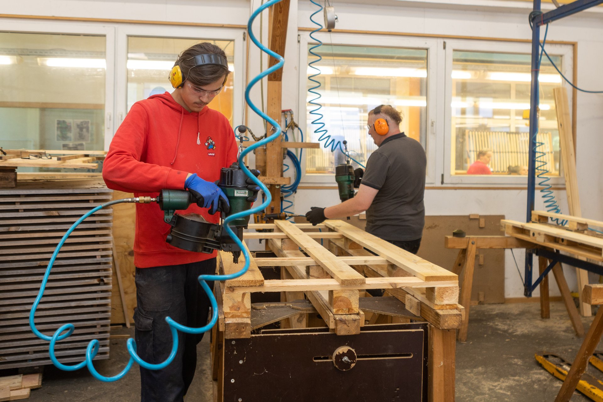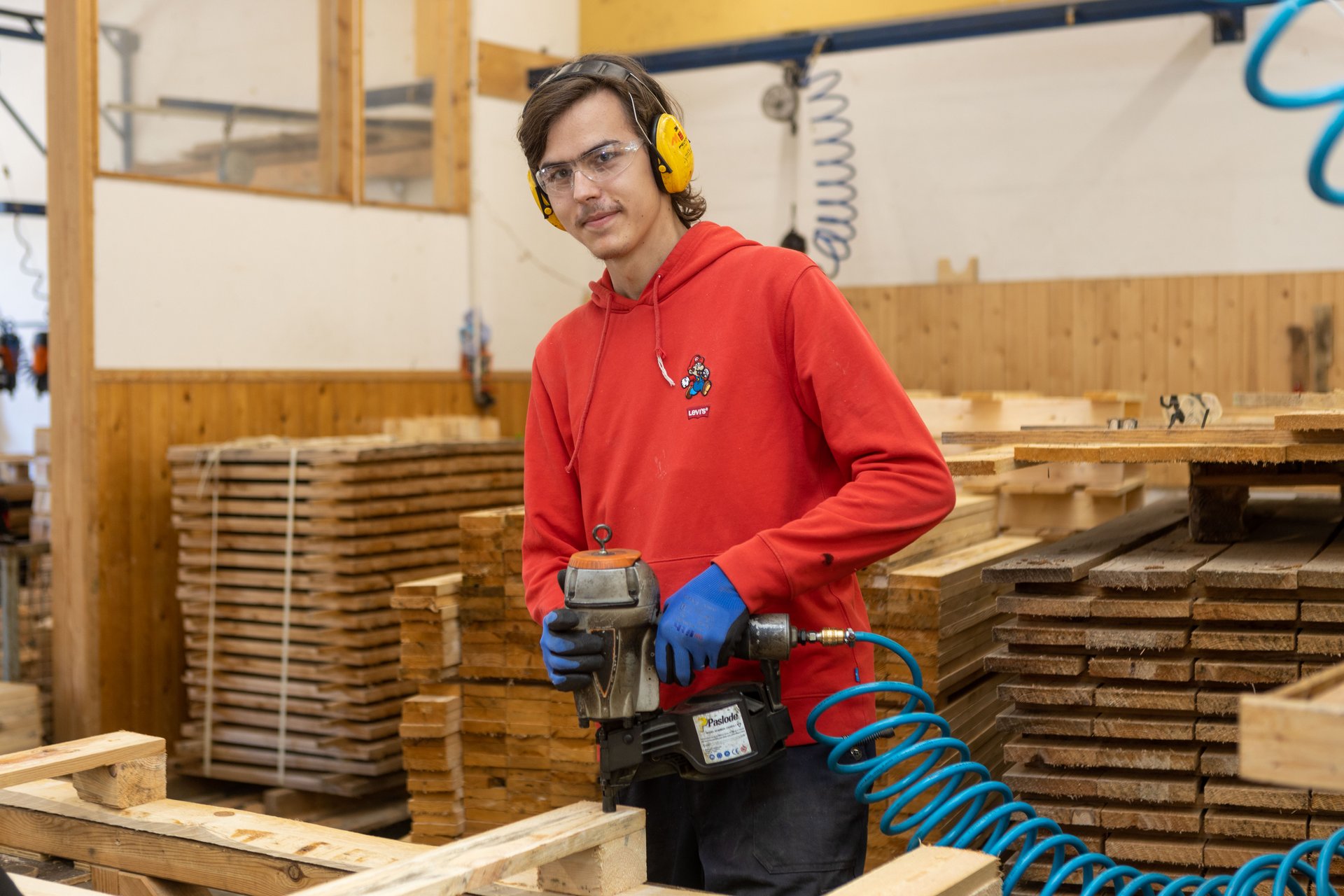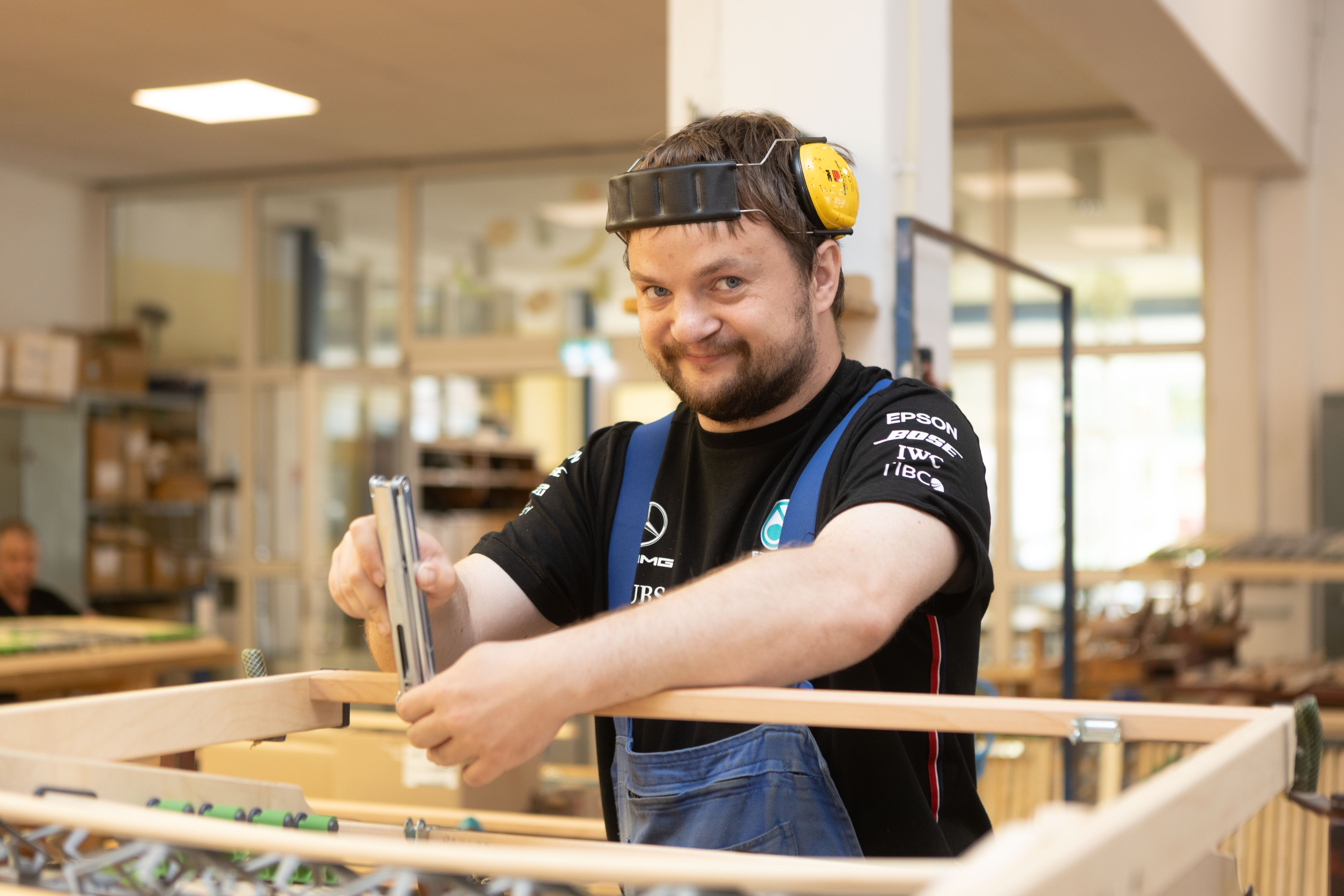 Unser Produktionsbereich Holzverarbeitung bietet bis zu 48 Beschäftigten vielfältige Arbeitsangebote. Von einfachen Komplettierungsarbeiten bis hin zu Arbeiten an professionellen Holzbearbeitungsmaschinen bietet unsere Tischlerei jedem Beschäftigten einen individuellen Arbeitsplatz. Klient*innen bedienen Flurförderzeuge, wie Gabelstapler und Ameise. Ihr Einsatz erleichtert den Transport der Halb- und Fertigwaren innerbetrieblich sowie das Be- und Entladen von LKW.
