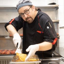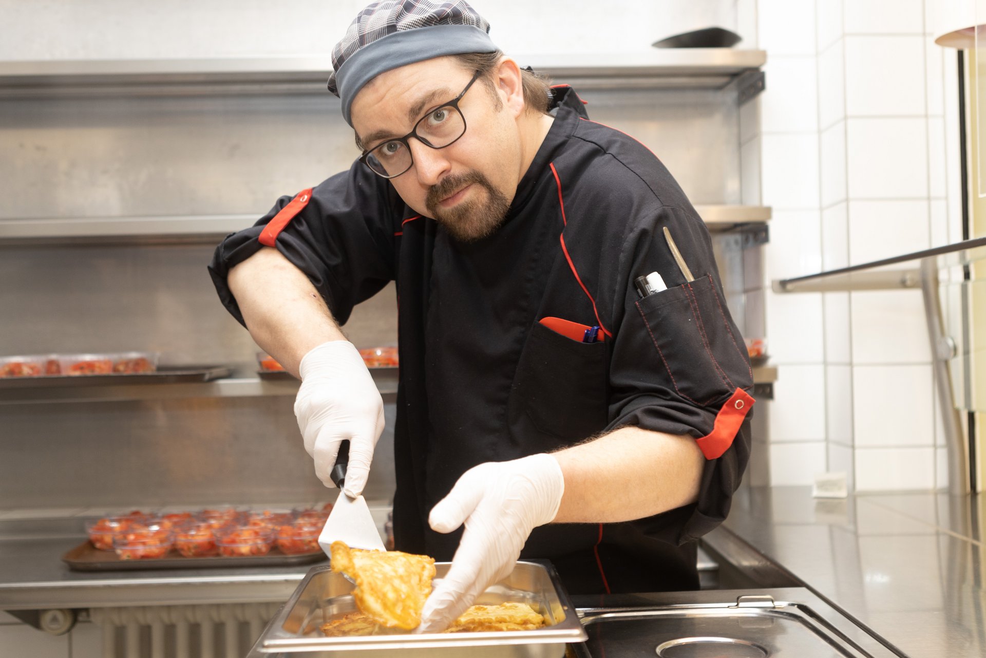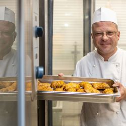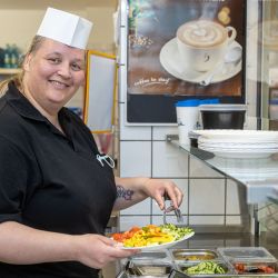 Täglich werden hier bis zu 600 Mittagessen frisch zubereitet. Externe Gäste, Beschäftigte und Mitarbeitende können zwischen drei verschiedenen warmen Gerichten wählen. Das Essen I hält ein Tagesangebot für Sie bereit, bei Essen II dürfen Sie sich auf ein vegetarisches Gericht freuen und Essen III kommt aus der gut bürgerlichen Küche. Außerdem können Sie sich an unserem Frischebuffet von unserem Kantinenpersonal Ihren Wunschsalat individuell zusammenstellen lassen.
